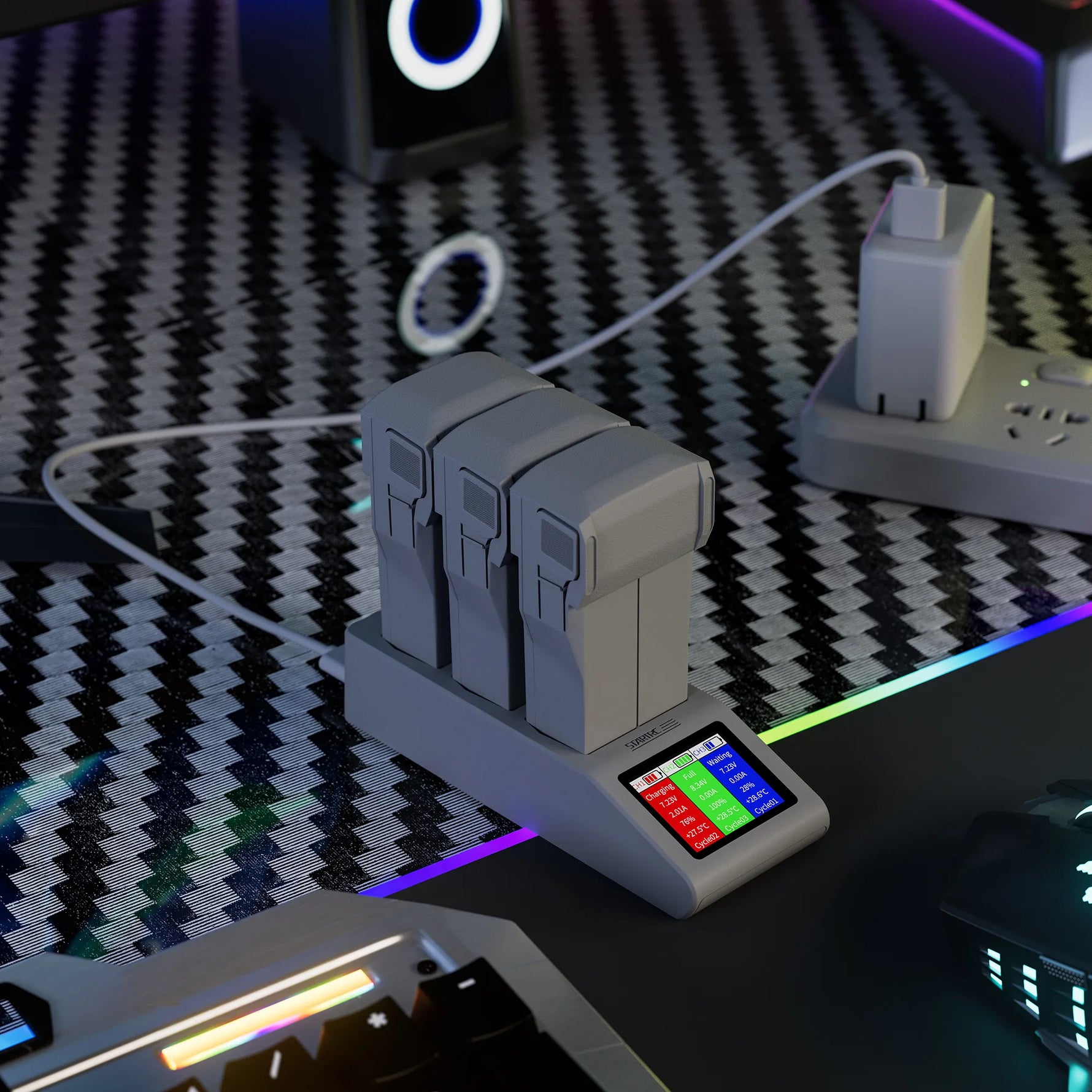 This STARTRC battery charger hub integrates smart functionality, efficient charging, and comprehensive safety: it features two core modes—Storage Mode (long-press power button to charge to 60% for long-term storage, auto-stops to prevent overcharging/discharging) and Full-Charge Mode (charges to 98–99% then cuts power to extend battery life, indicated by a green light). It enables rapid charging (3×2453mAh batteries in ~135 mins, 3×3850mAh in ~195 mins) in descending order of battery level, with upgraded circuitry for stable output in extreme conditions. It also has 8-layer protection (guards against over-current, over-voltage, etc.) and a real-time LCD display showing voltage, current, battery level, and temperature per slot. A DJI 30W USB-C/PD fast charger (not included) is required for max efficiency.