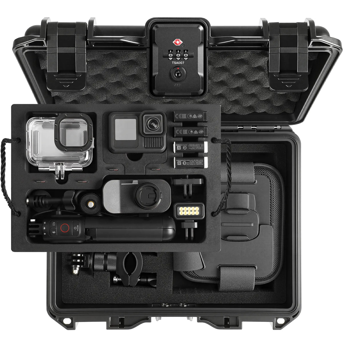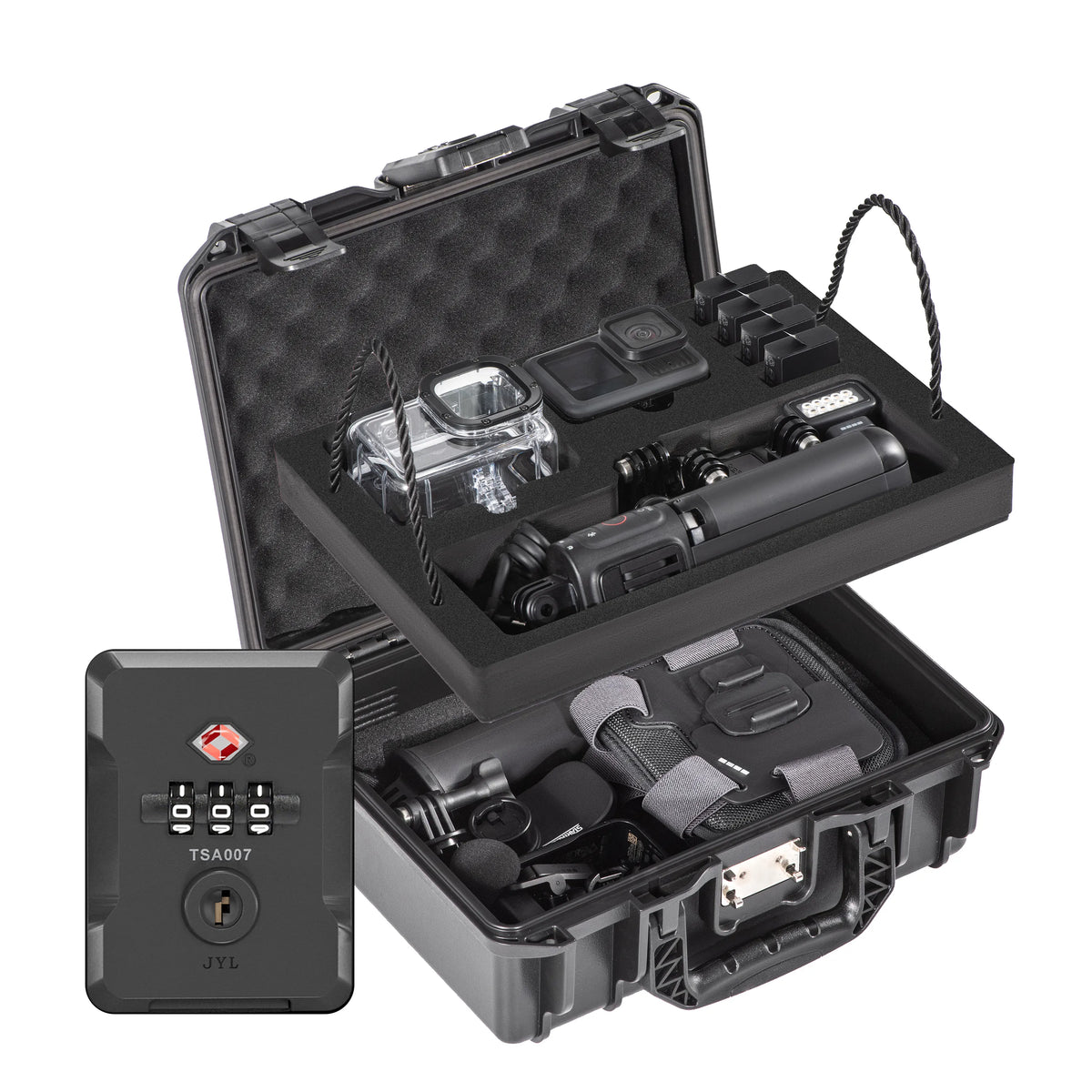 This multi-compatible waterproof case works with a range of action cameras, including GoPro Hero series, DJI Action, Insta360 ACE/ACE Pro, and GO3/3s, supporting DIY assembly for customized matching. Its double-layer design offers large-capacity storage: the upper layer holds a camera (even with a cage), waterproof shell, 4 batteries, plus custom slots for floating handles, backpack clips, cables, and adapters; the lower layer features removable DIY compartments for multiple cameras or extra accessories. Made of high-quality PP (IP67 waterproof/dustproof, wear-resistant, pressure-resistant, shockproof) for the outer shell, and custom EVA+sponge (with an elastic sponge pad on the lid) for the inner lining, it provides full protection for your gear. It also has a TSA metal combination lock for security and a snap-on closure for easy access.