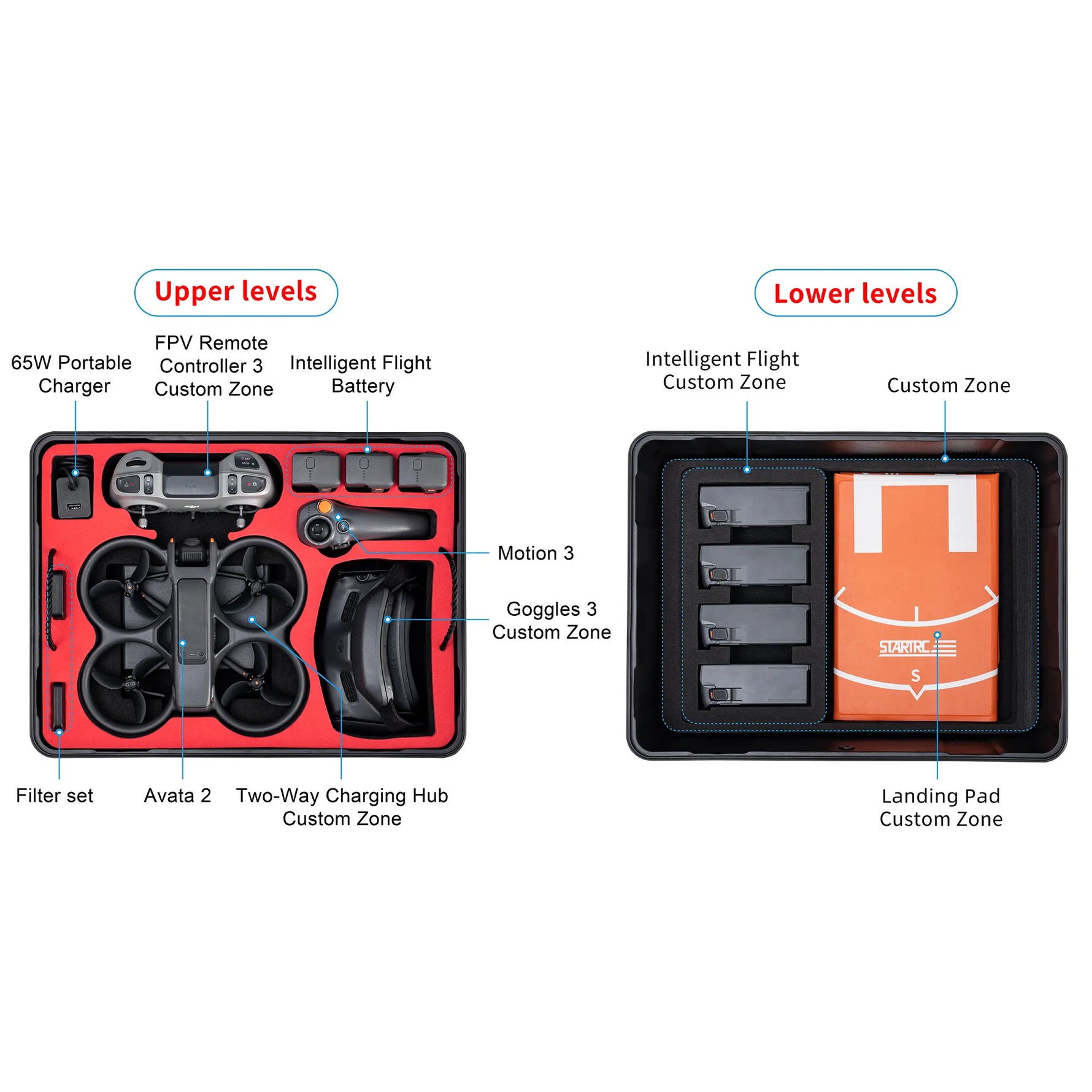 El estuche rígido STARTRC para DJI Avata 2 fue diseñado para organizar, proteger y transportar. Su organización de precisión de doble capa, con ranuras precortadas y desmontables, se adapta perfectamente a tu configuración Avata 2. La ingeniosa zona superior de acceso rápido alberga 1 dron Avata 2, un centro de carga bidireccional, 3 baterías de vuelo inteligentes, 1 gafa, 3 controles remotos FPV, el estuche original para filtros, un cargador de 65 W y pequeños accesorios (cables, hélices). El compartimento inferior para baterías, con separadores resistentes a los golpes, permite almacenar más de 4 baterías adicionales, además de espacio extra para plataformas de aterrizaje o kits de herramientas, todo de forma segura.